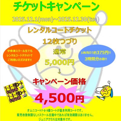 スクール生様同士でアウトコートレンタルをされると、お1人様1時間500円(税込)でご利用頂けます。 12枚つづり(12時間分)のレンタルコートチケットが通常5,000円(税込)のところ キャンペーン中はなんと・・・4,500円(税込)!! スクール在籍中であれば有効期限はありません(^^) 宇多津のスクー...