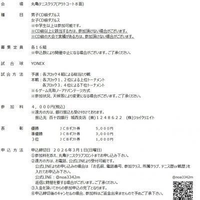 来年1月25日(日)に新春ミックスダブルス大会を開催いたします!! オープン・CD級 各16組になります。 2026年丸亀テニスクラブで開催する初めての大会になります。 優勝目指すのも良し!!試合を楽しむのも良し! 2025年初めての思いで作りに如何でしょうか? 皆様のご参加をスタッフ一同お待ちしており...